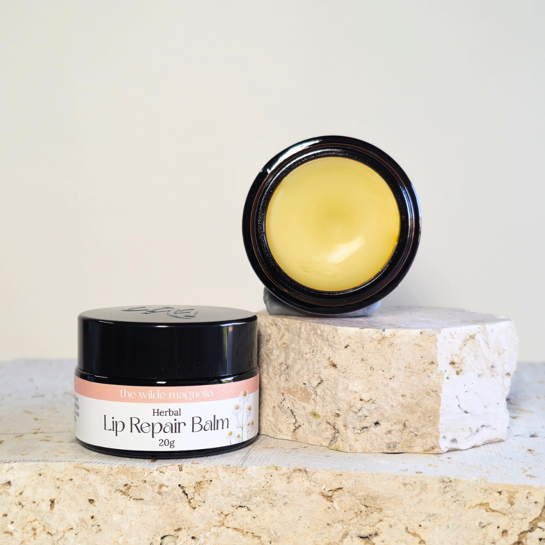 Each jar of our herbal lip repair balm begins with a slow, cold infusion of organic chamomile flowers and marshmallow root into a nourishing base of olive oil. This gentle method preserves the natural properties of the herbs without heat damage and maintains their calming, hydrating goodness.